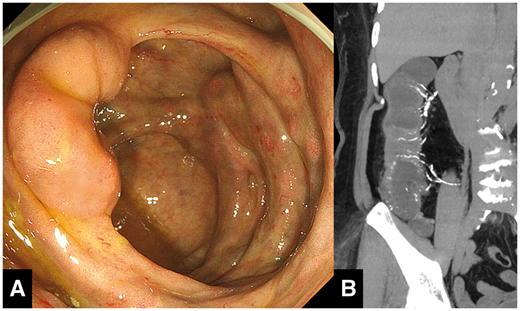 症状としては長期にわたる腹痛や血便があり、回盲部から横行結腸にかけて大腸内視鏡所見で大腸粘膜が深青色、黒紫色に変化し、粘膜の菲薄化や潰瘍などが認められます。またCTでは腸間膜静脈の著明な石灰化が描出されます。