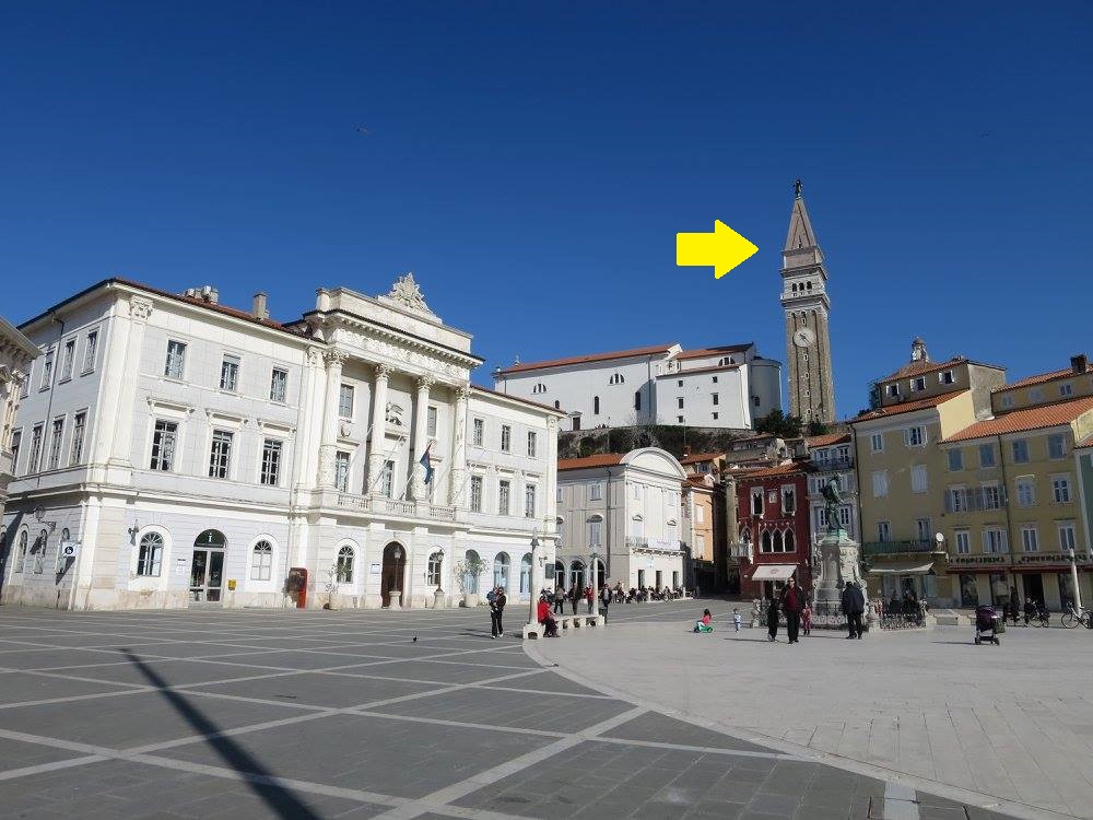 日本では「Pencil sign」と呼称されることの多い画像所見ですが「Steeple sign」と呼ばれるのが一般的なようです。Steepleというのは教会の尖塔のことです(写真はスロベニア・Piranの街並みで教会の尖塔が写っています)。