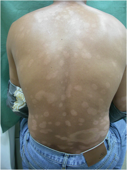ハンセン病は病型が様々あり、特徴的な皮膚所見を呈するものがあります。本症例では感覚鈍麻を生じた白斑が主体(実は頸部の大耳介神経も肥厚しているのですが写真がぶれていて使い物になりませんでした)であり一見、薬剤による白斑や尋常性白斑を想起しがちになりますが、生検された皮膚からPCRでMycobacterium lepraeが検出され診断に至っています。