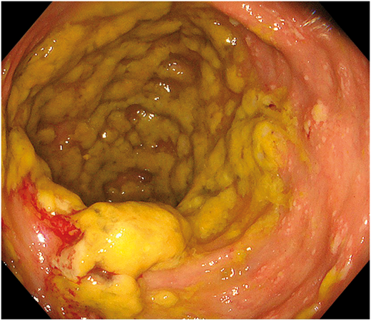 画像自体はGoogleで「偽膜性大腸炎」と検索すれば腐るほど出てくる典型的なCaseです。