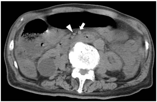 絞扼性イレウスやNOMI、そして今回の投稿症例である上腸間膜動脈閉塞症など腸管虚血を来たす疾患では、腹膜刺激徴候を伴わない激烈な疼痛(腸管穿孔に至っていない場合)を来たすのが特徴です。造影CTを撮影しなければ診断できない場合が多いのですが、単純CTしかとれない場合でも有用な所見として今回Acceptされた「Smaller SMV sign」があります。本来ならばSMA径のほうが細くなるのですが、静脈系の還流障害でSMVへの血流流量が減少し、SMA径に比べてSMV径が小さくなる逆転現象が起きます。