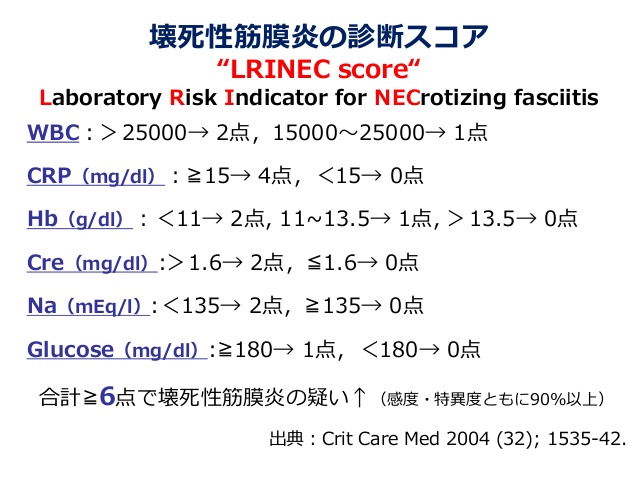 診断に関しては早期に蜂窩織炎と鑑別が必要であり、一説によると15-34%程度しか正診されていないという報告もあります。他の壊死性筋膜炎と同様に、診断にはLRINEC score(ライネックスコア)が有用です。